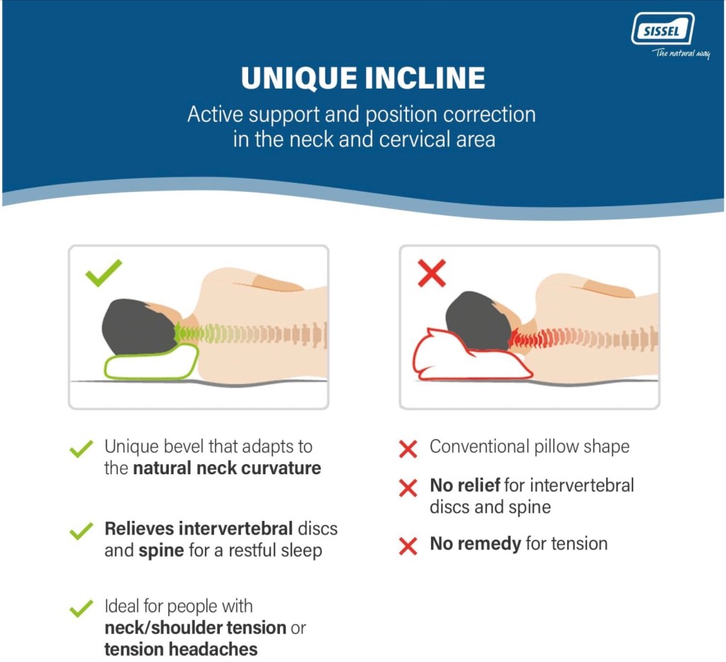 It is best to check the sizing of the pillow before you purchase. If you have any doubts about which pillow to choose do not hesitate to contact me and I will be happy to help out with extra details. I personally use Sissel Soft Plus – Made in Sweden. It has got an extra ‘platform’ to make it couple of centimetres higher. For me- It’s been life changing.